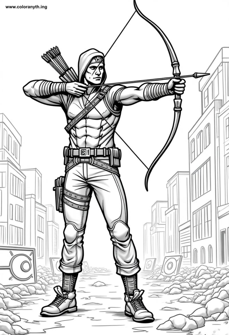 Dive into a world of adventure with our dynamic coloring page of a heroic archer inspired by iconic superhero lore. Set against a backdrop of a post-apocalyptic city street, this illustration invites you to bring to life a character ready for action, poised to confront challenges head-on. With stunning monochromatic details and a powerful stance, this page is perfect for anyone eager to unleash their creativity while experiencing the thrill of heroism. Color in the tactical elements of his outfit, the debris-laden streets, and the looming buildings, and let your imagination soar as you bring this scene to vivid life!