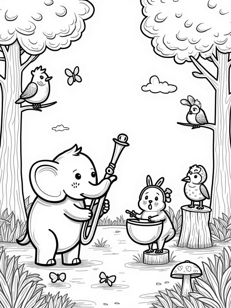In this lively scene, a friendly elephant is playing a giant tuba, its trunk curling around the instrument as if it's part of the music. Nearby, a cheerful rabbit is tapping a tambourine with its paws, adding to the fun. Up in the trees, a wise owl conducts the whole performance with a leafy baton, keeping everything in perfect harmony. There’s even a playful squirrel balancing on a tree stump, shaking maracas as colorful butterflies flutter around, making the whole forest feel alive!