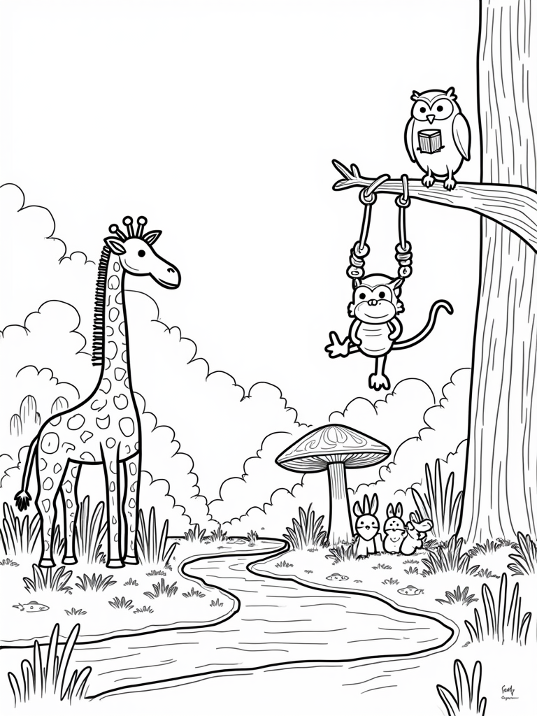 In this lively scene, a tall giraffe is stretching its long neck around a giant, colorful mushroom. Above, a playful monkey swings from a vine, adding a touch of fun. Meanwhile, a group of bouncy rabbits is hopping around a patch of oversized carrots, just having a blast in the sun. And look! A wise old owl is perched nearby, clutching a tiny book in its talons, ready to share some forest wisdom.