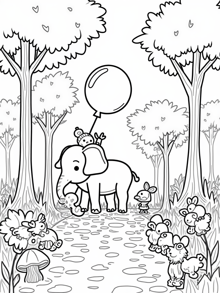 This delightful scene captures a lively animal parade set in a bright and cheerful forest glade. Towering trees with huge leaves create a fun canopy, while a colorful pebble path leads the way. Kids will love the friendly elephant balancing a big balloon on its trunk—how cool is that? Surrounding it are playful squirrels tossing acorns back and forth, adding to the joyful atmosphere.