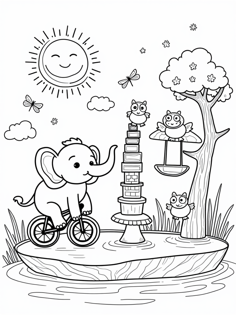 Imagine a giant lily pad floating gracefully in a calm pond, where playful animals are having the time of their lives! There’s a cheerful elephant balancing on a unicycle, showing off its skills next to a colorful stack of blocks. Not too far away, a group of lively frogs are leaping between oversized mushrooms, making it look like a fun game of hopscotch!