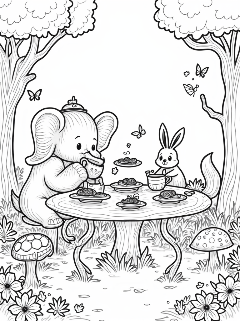 In this delightful scene, a friendly elephant is pouring tea from a flower-shaped teapot at a beautifully set table made of twisting vines. The table is overflowing with oversized teacups and giant cookies that look almost too big to eat! Nearby, a curious rabbit balances on a stack of books, probably trying to get a better view of the party.
