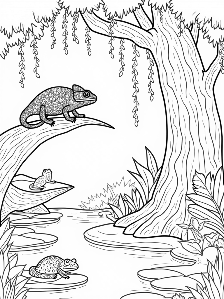 Charming Jungle Canopy with Frogs and Chameleon Coloring Page
