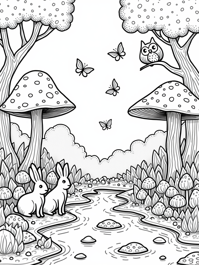 In this delightful scene, oversized mushrooms create a colorful canopy above a gentle river that flows peacefully through the forest glade. Beneath the mushrooms, playful fish dart around the smooth pebbles, bringing life to the water. Nearby, a family of cheerful rabbits hops around a patch of gigantic carrots, looking for the tastiest ones to munch on. You can almost hear the soft rustle of leaves as a wise old owl keeps watch from his twisted branch in the background.