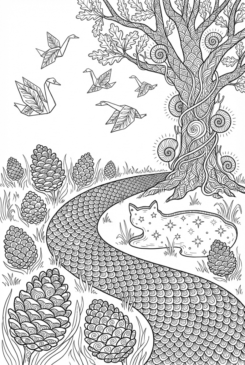 Take a look at this hand‑drawn illustration. A river made of tiny fish‑scale patterns snakes through a meadow dotted with giant pinecones. Towering above it all is an old oak whose branches curl around glowing snail shells. Above the canopy, a flock of origami swans—each shaped from folded leaves—glides in the sky, while down below a moonlit pond mirrors the stars in the silhouette of a cat.