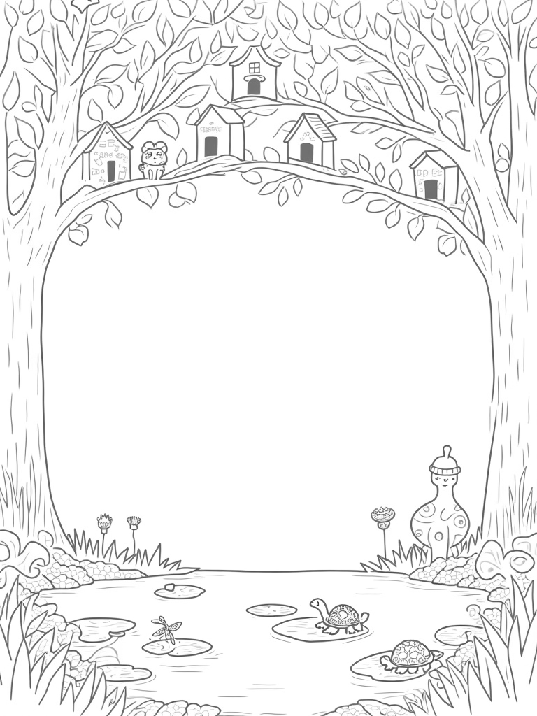 This enchanting scene showcases a vibrant forest canopy filled with oversized leaves, creating a beautiful natural mosaic. Look closely and you'll spot colorful birdhouses designed to look like an owl, a fox, and a turtle, all perched among the branches. Below, a serene pond mirrors the sky, dotted with lily pads that each play host to a little creature like a frog, a dragonfly, and another turtle. It's a perfect little ecosystem!