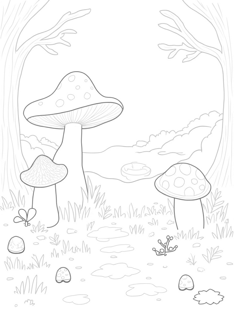 Forest Clearing with Animal-Shaped Mushrooms and a Serene Pond Coloring Page