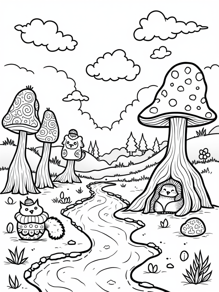 In this enchanting forest clearing, oversized mushrooms burst with color and patterns, making it a magical spot for coloring! A gentle river winds its way through, lined with smooth stones shaped like animal footprints. It’s the perfect place for little imaginations to run wild.