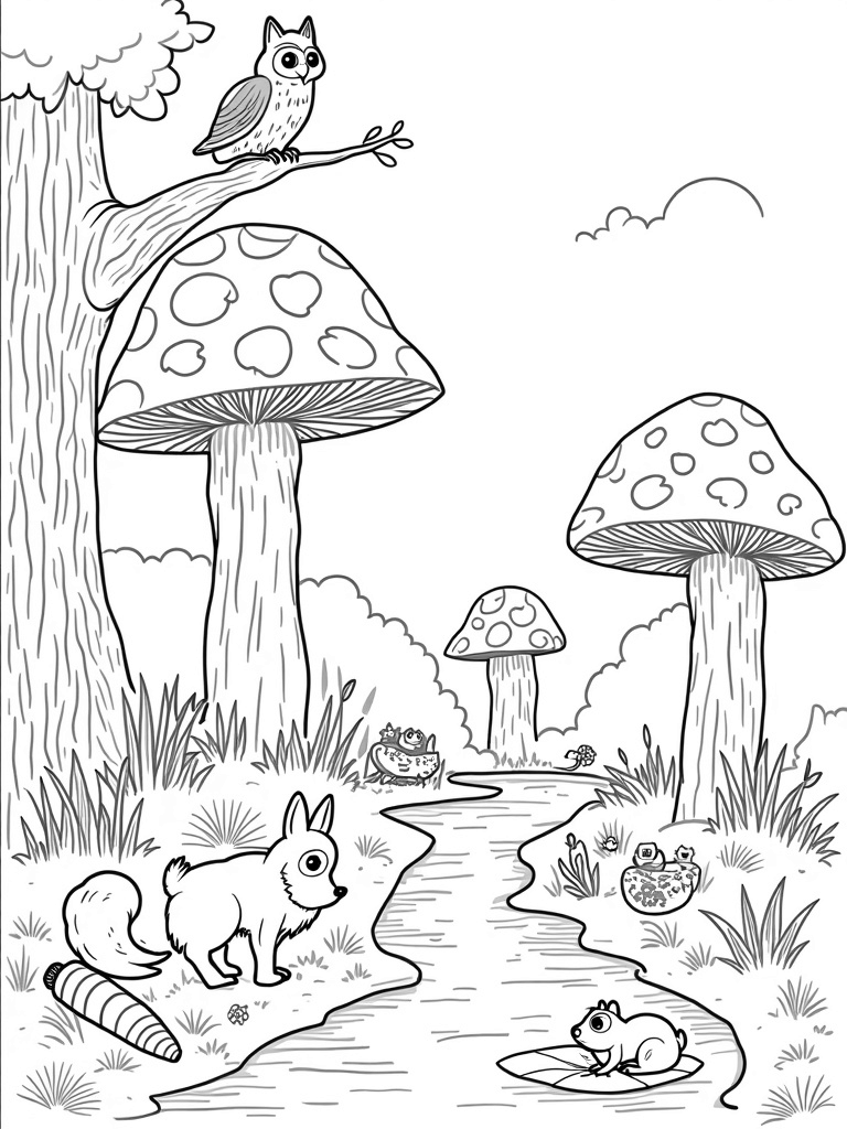 Check out this free, printable coloring page featuring a whimsical forest filled with animals! Kids will love coloring the fox, rabbit, and all the oversized mushrooms. Perfect for a fun afternoon of creativity.