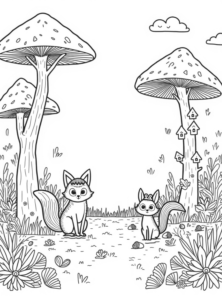 Fox with Feathered Crown in a Mushroom Canopy Coloring Page