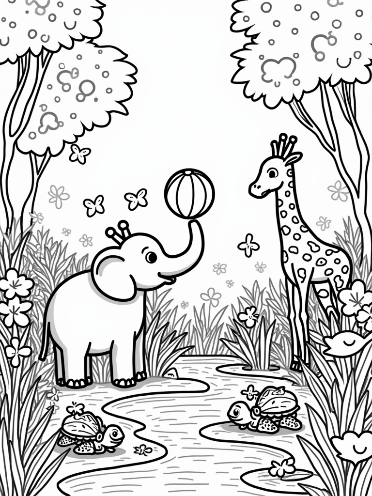 This coloring page showcases a vibrant jungle clearing where a giant, friendly elephant is balancing a colorful beach ball on its trunk. Butterflies flutter around, adding a touch of whimsy to the scene. Nearby, a tall giraffe stretches its neck to munch on star-shaped fruits hanging from a low branch. It’s a delightful moment in nature!
