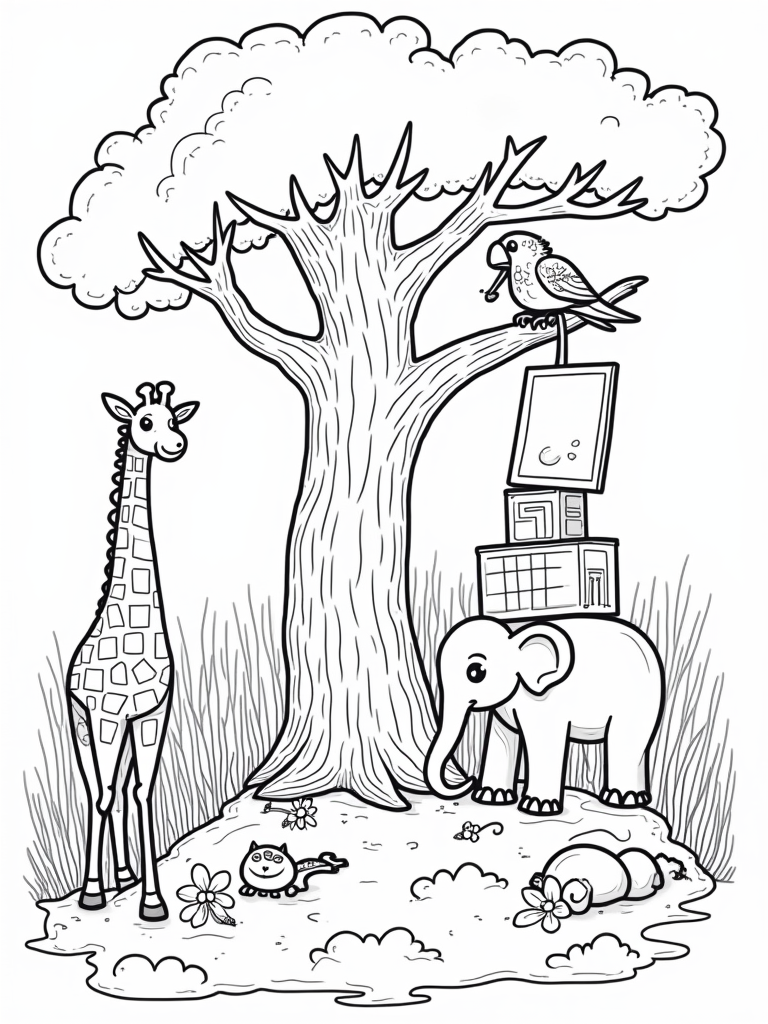 Imagine a vibrant jungle filled with friendly, oversized animals! At the heart of this scene, there's a massive tree with a spiraling trunk, its branches overflowing with colorful leaves. A playful parrot is perched high up, holding a paintbrush and splashing bright colors onto a canvas hanging from the tree. It looks like a fun art party is happening!