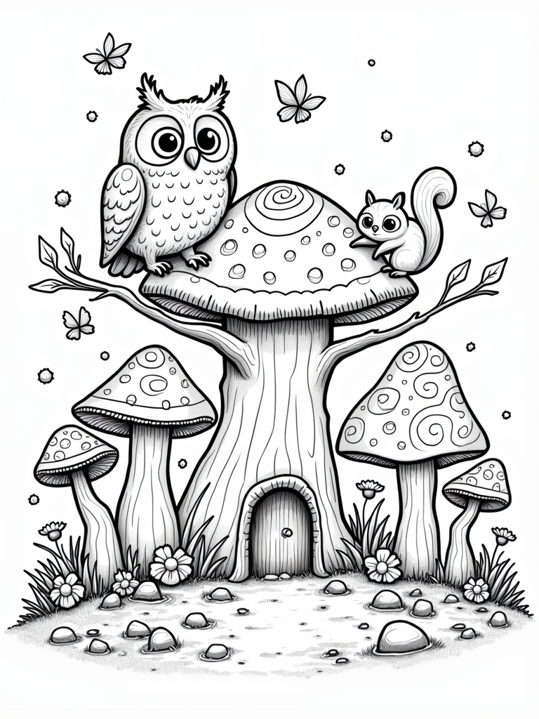 Check out this free, printable coloring page featuring a friendly owl, a playful squirrel, and oversized mushrooms. It's perfect for kids who love animals and nature, and it's sure to spark their creativity while they color!
