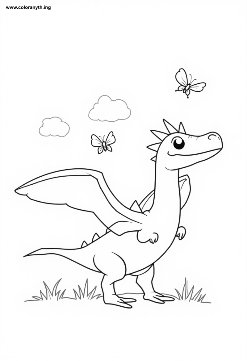 Dive into the whimsical world of dinosaurs with our adorable Pteranodon coloring page! This charming cartoon character stands proudly with its large, partially spread wings and a cheerful smile, inviting you to bring it to life with your favorite colors. Surrounded by playful butterflies and fluffy clouds, this scene is not just about coloring; it’s about sparking creativity and imagination. Perfect for dinosaur enthusiasts and young artists alike, this page promises hours of fun as you explore the vibrant Jurassic atmosphere. Let your imagination soar as you fill the sky with color!
