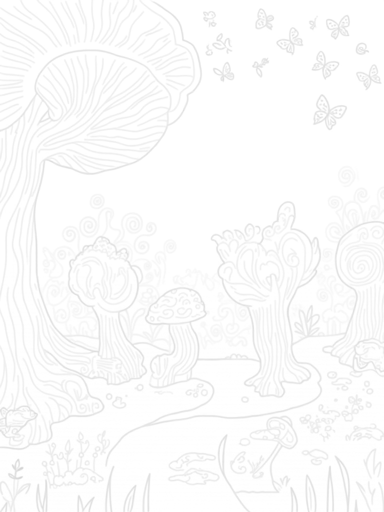 Here we have a delightful scene in a whimsical forest! Giant mushrooms tower over a winding path, inviting little explorers to imagine all sorts of adventures. Alongside the path, a parade of colorful butterflies flutters by, each with their own unique patterns on their wings. Nestled by the roots of a massive tree, a cluster of hedgehogs curls up in a cozy, spiraled formation, adding a touch of cuteness to the scene.