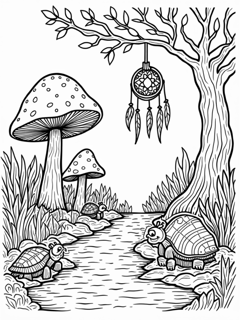 Giant Mushrooms and Turtles in a Forest Glade Coloring Page