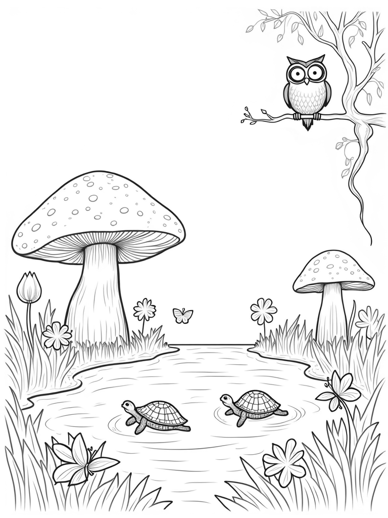 Giant Mushrooms and Turtles in a Serene Pond Coloring Page