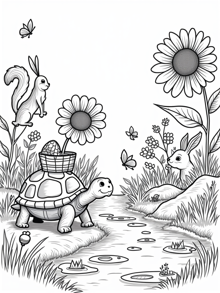 This scene is all about fun and nature! Picture a giant tortoise with a beautifully patterned shell, slowly carrying a colorful picnic basket on its back. It looks like it’s ready for a snack in this vibrant garden. Nearby, a cheerful squirrel hangs upside down from a branch, munching on an acorn. How silly is that?