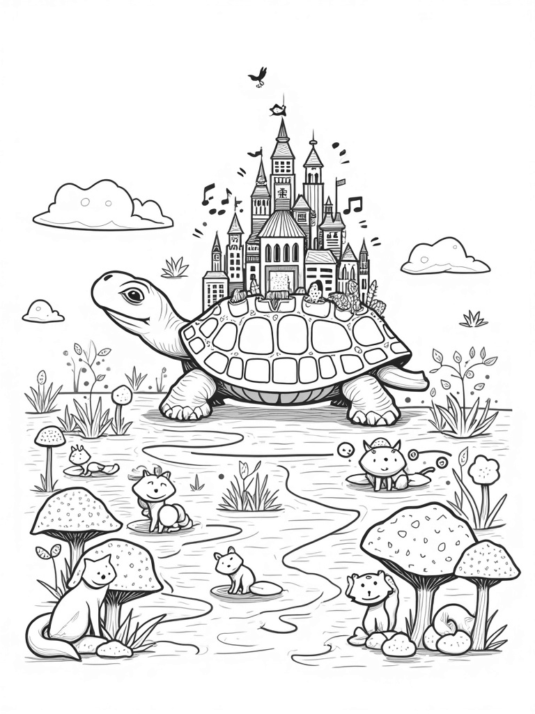 This coloring page brings to life a giant turtle that carries a bustling city on its back. You can see detailed buildings poking out from the turtle's shell, surrounded by trees that sway gently in the breeze. Look closely, and you’ll spot cheerful birds flitting around the branches, adding even more life to this magical scene!