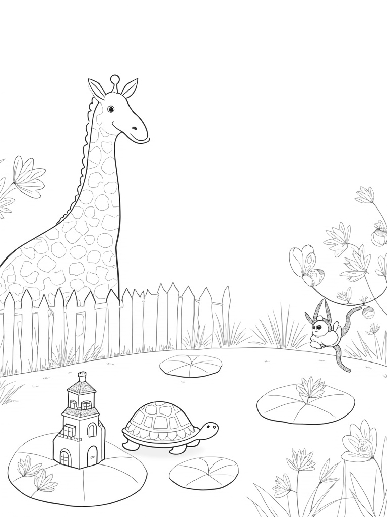 This delightful scene is packed with playful characters in a vibrant garden. A tall giraffe with a spiraled neck peeks over a fence made from tree branches, keeping an eye on the action below. Right at the base of this majestic creature, a curious tortoise strolls around, proudly carrying a tiny house on its back. It’s surrounded by soft patches of grass, making it the perfect spot for a little rest.