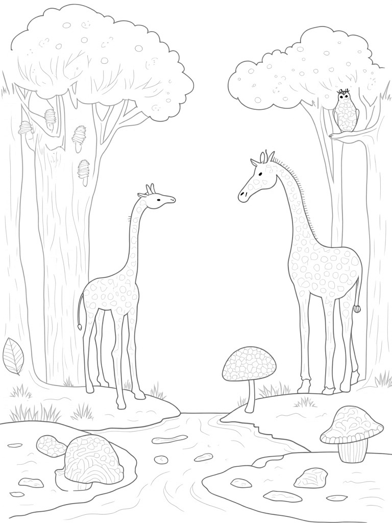 Giraffe Trees and Owl Leaves in a Magical Forest Coloring Page