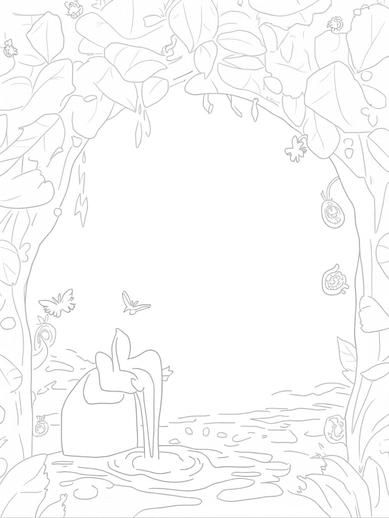 This scene takes you to a magical jungle canopy where giant leaves create a natural ceiling overhead. Below, there's a peaceful pond that mirrors the sky, with lily pads shaped like cute animal silhouettes floating on the surface. Just imagine coloring in those fun shapes!