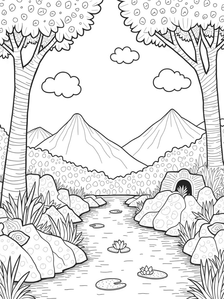 In the distance, a serene mountain range rises with peaks that are soft and fluffy. It’s the perfect backdrop for your colorful jungle scene! You can choose bright colors for the flowers, fun patterns for the leaves, and maybe even add some silly details of your own.