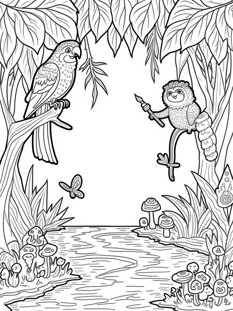 Check out this free, printable coloring page featuring a jungle canopy with a parrot and a sloth! Perfect for kids who love animals, this design is sure to spark creativity and fun.