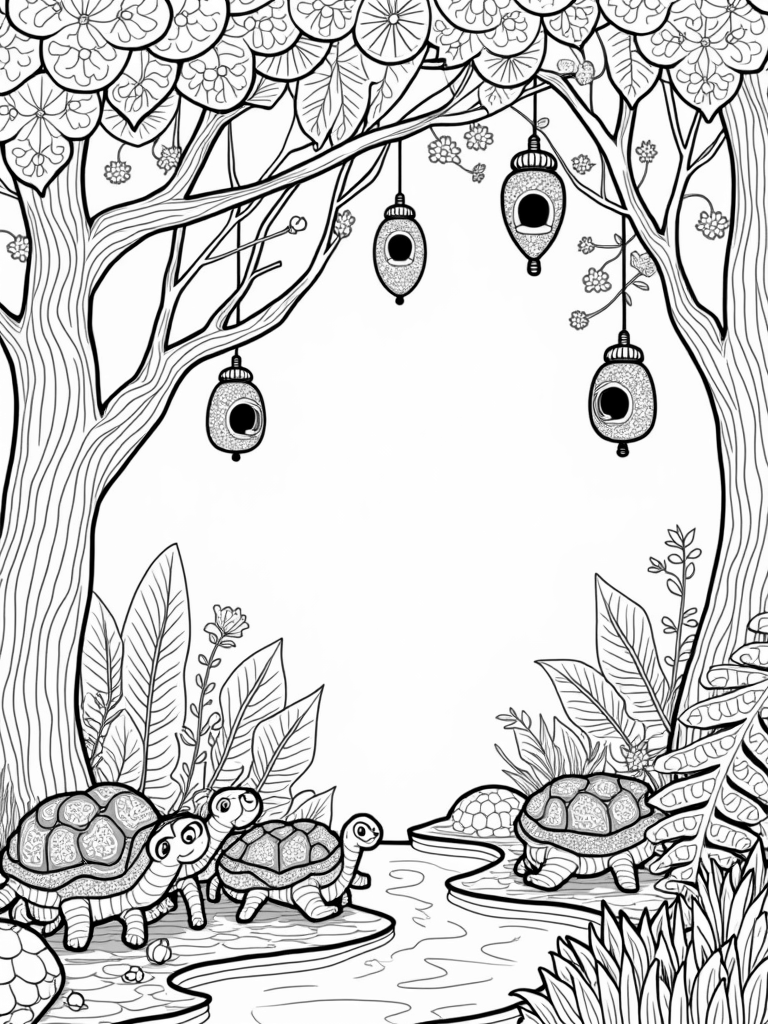 In the foreground, a family of chubby, cartoonish turtles peeks out from behind a giant fern. Their shells are adorned with fun spirals and dots, making them extra cute! These little guys are perfect for adding some playful colors. Can you imagine what colors you’d use for their shells? Maybe bright oranges and greens?
