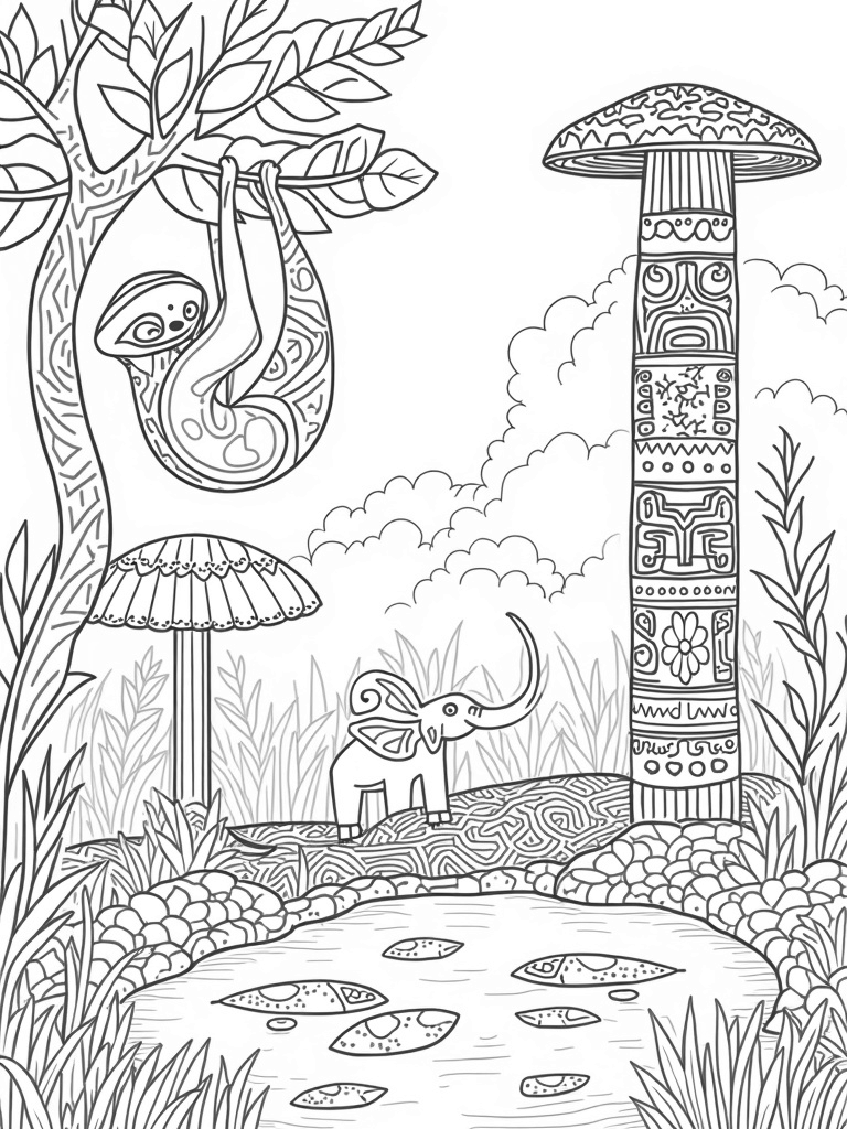 Imagine a vibrant jungle filled with oversized, patterned leaves acting as umbrellas for all sorts of animals! You’ll see a laid-back sloth hanging from a vine, stretching its limbs toward a cool totem pole that features swirling snakes and birds. Nearby, an elephant is striking a pose on a giant mushroom, showing off its ear decorated with beautiful floral designs.