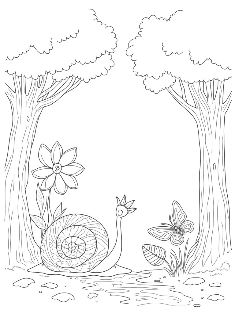 Check out this free, printable coloring page featuring a magical forest clearing with oversized mushrooms, a spiraling snail shell, and fluttering butterflies. Perfect for kids who love animals and nature!