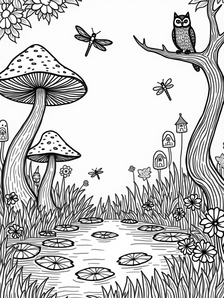 Magical Forest Glade with Dragonflies and Mushrooms Coloring Page