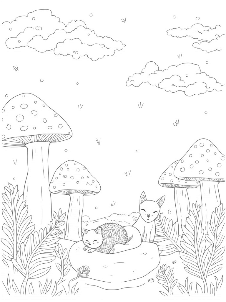 Picture a forest where mushrooms stand so tall, they could almost be mistaken for trees! Their colorful caps are decorated with all sorts of fun patterns, just waiting for your favorite colors to bring them to life. Nestled at the base of these giants, a family of hedgehogs cuddles together, forming a cozy little ball. You can almost feel the warmth of their snuggles!