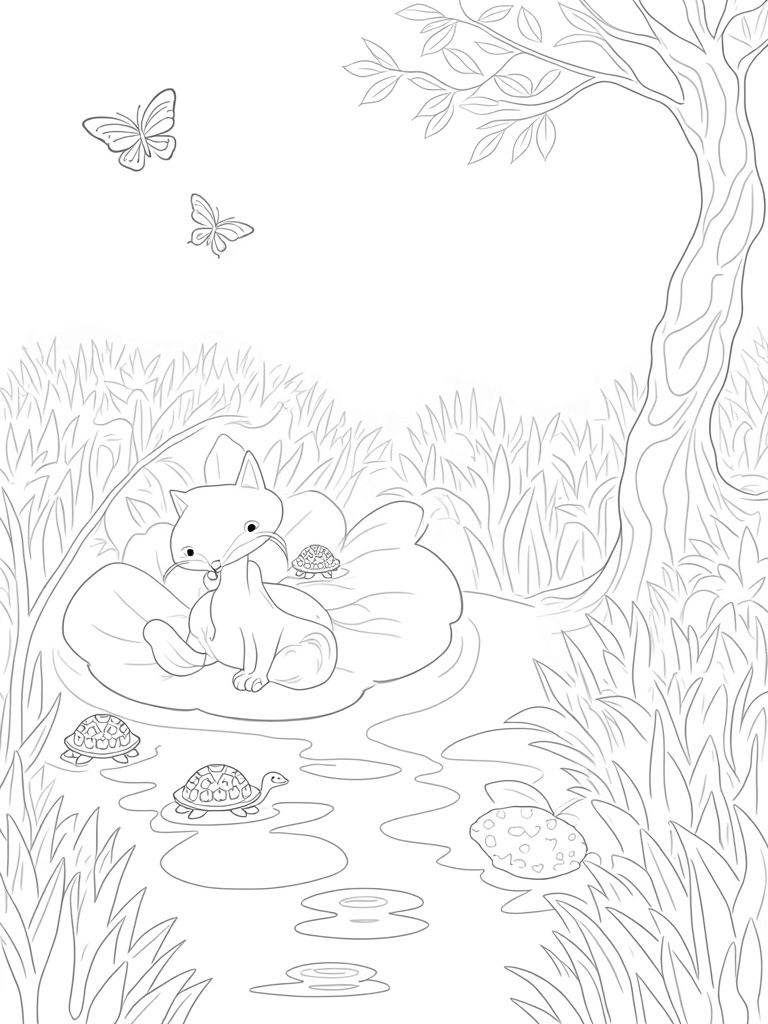 This delightful scene showcases a majestic fox lounging on a giant lily pad, surrounded by a colorful garden filled with oversized flowers. A winding stream flows nearby, where turtles wearing tiny top hats glide past heart-shaped leaves. Just imagine the fun they’re having!