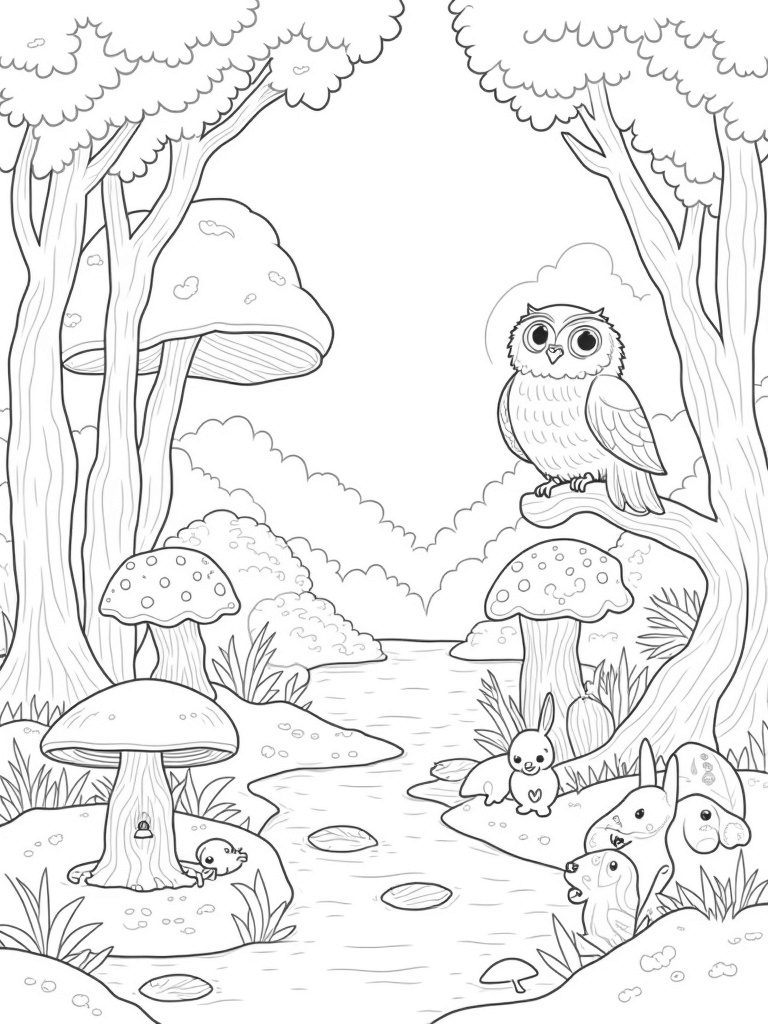 You’ll find a delightful forest scene filled with oversized mushrooms and towering ferns. At the heart of it all, a majestic owl perches on a twisted branch, showcasing its beautifully patterned feathers. Just below, a winding river flows gently, with lily pads and playful fish adding a splash of life to the scene. Nearby, a family of curious rabbits peeks out from behind a giant acorn, their long ears perked up in excitement!