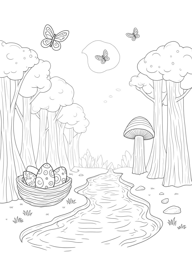 This page is all about a magical forest filled with towering mushroom trees. Each mushroom has a unique animal print cap that makes them look like they belong in a fairy tale! At the base of these giant fungi, you'll find a beautifully detailed bird's nest cradling some oversized eggs, each one splashed with vibrant geometric designs. Just nearby, a winding river flows gently, lined with rocks shaped like adorable animal silhouettes.