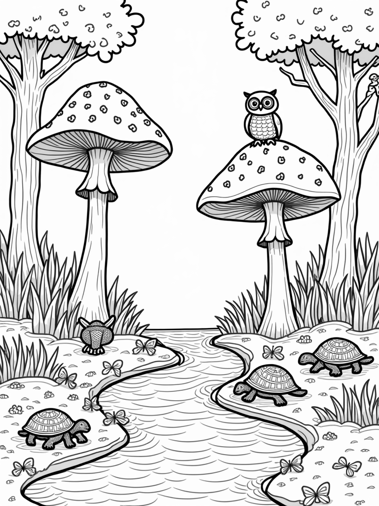 Right beneath the mushrooms, a sparkling river winds its way through the scene. The water shimmers like a mosaic, reflecting the sunlight and creating a beautiful view. Next to the river, you'll find a family of turtles soaking up the warm sunshine. Each turtle has its own special shell design, making them as unique as you!