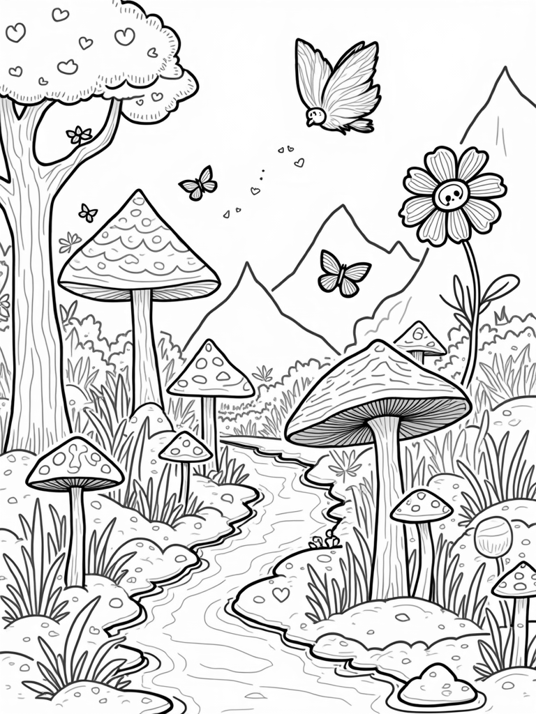 Oversized Mushrooms and Animal Patterns in a Whimsical Forest Coloring Page