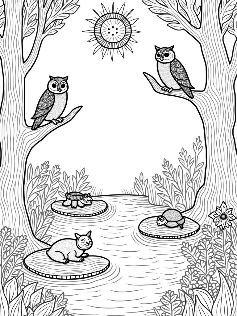 Kids will have a blast bringing this whimsical world to life with their favorite colors! There's so much to fill in, from the intricate designs on the owls to the vibrant lily pads. Each animal adds its own charm, making it a fun challenge for little artists to decide what colors to use. Plus, it’s a great way to spark their imagination and let their creativity soar!