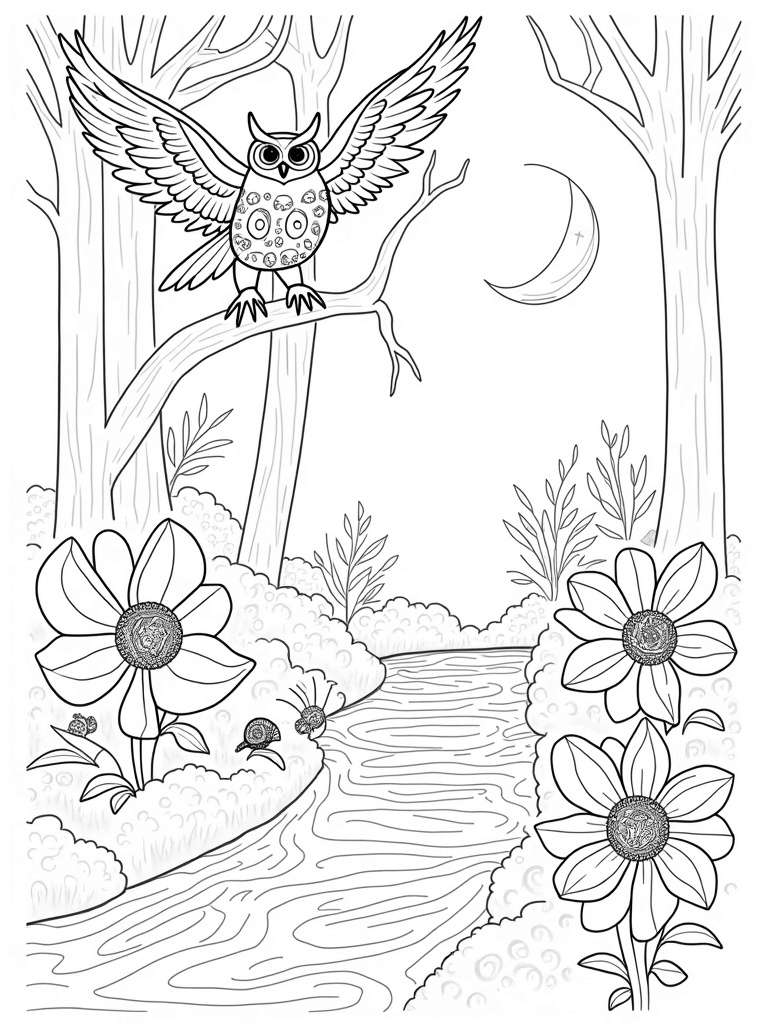 Spiraled Trees and a Giant Owl in a Colorful Forest Coloring Page
