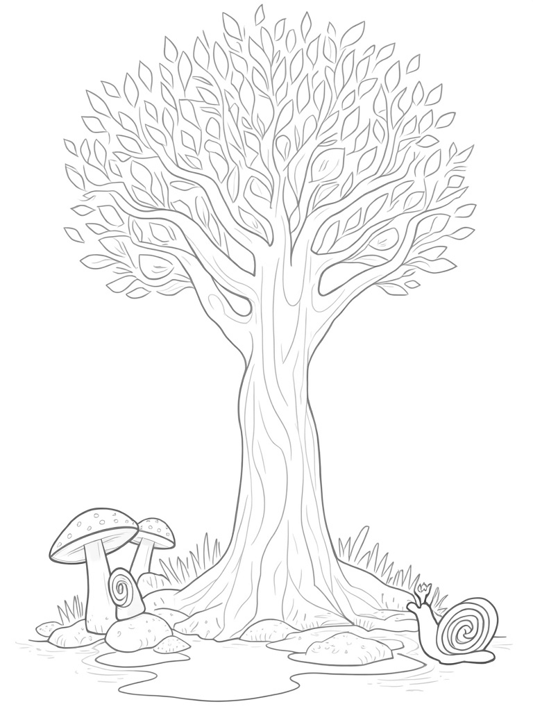 At the base of the tree, a gentle stream flows peacefully, bordered by smooth stones that have playful animal faces—perfect for sparking a child's imagination! Nearby, a cluster of oversized mushrooms with intricate patterns creates a shady retreat for a family of snails. Each snail carries a tiny shell that matches the whimsical style of the birdhouses above, adding even more charm to this enchanting scene.