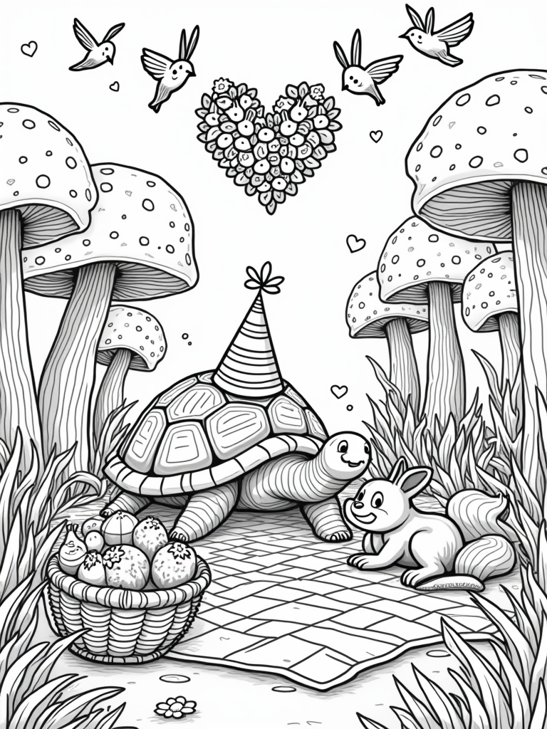 This scene is bursting with fun! A giant tortoise wearing a bright party hat is the star of the show, spreading smiles all around. Cheerful rabbits are bouncing in the air, adding a lively touch to the forest clearing. Just look at those happy little faces!