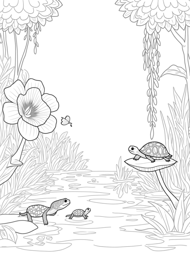 In this lively jungle scene, oversized flowers burst with color, their petals curling like little spirals. At the center, a calm turtle sits on a giant lily pad, taking in the sights. Nearby, a dazzling butterfly flutters around, making everything feel extra magical. The background is filled with cascading leaves creating a lush curtain, while sneaky chameleons blend right into the vibrant foliage, just waiting to be spotted.