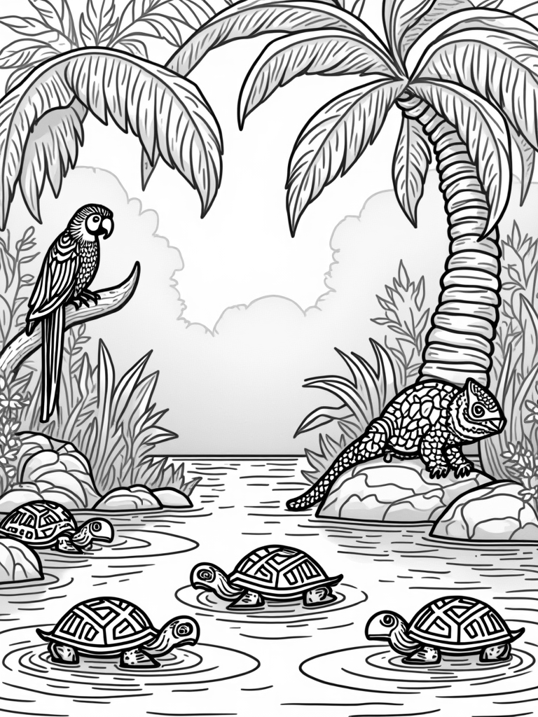 Check out this free, printable coloring page featuring a jungle scene with turtles, a parrot, and a chameleon. Perfect for kids who love animals and nature!