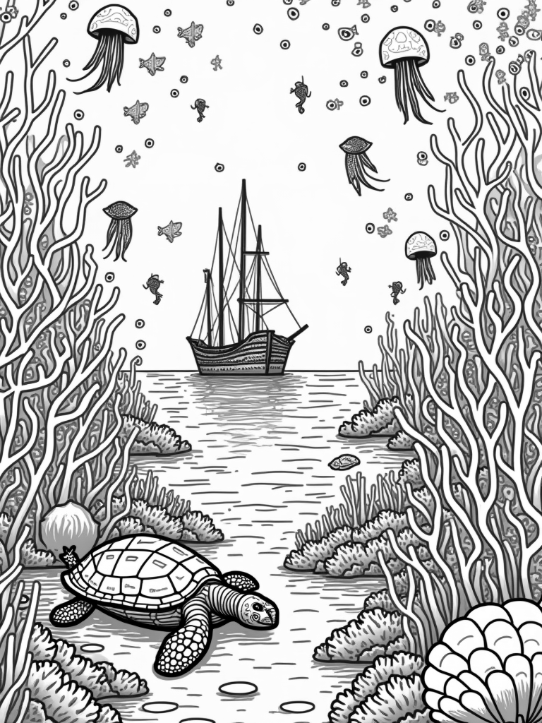 A giant sea turtle glides smoothly through this vibrant scene, its shell covered in intricate patterns that remind us of a cozy quilt. And look closely at the sunken ship in the background! It’s not just a spooky wreck; it’s a home for curious seahorses that have made their nest around the rusty anchor. What a cool place for them to live!