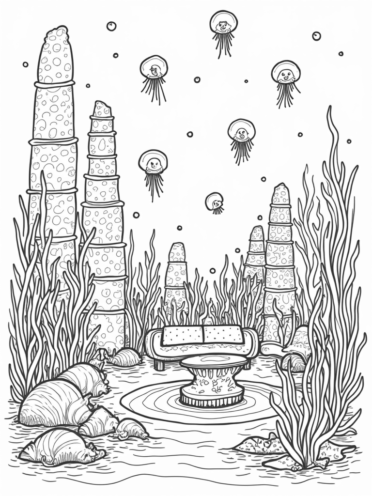 This scene captures a magical underwater garden, filled with oversized seashells that serve as cozy homes for all kinds of colorful fish. You’ll see towering coral structures that look like they could reach the sky, each one decorated with beautiful patterns. As you color, imagine the gentle current swirling around a giant starfish, which is so big it even acts as a coffee table!