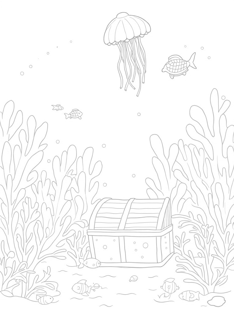 Floating above all the excitement is a big, friendly jellyfish. Its tentacles drift gracefully, adding a touch of magic to the scene. Down below, there’s a treasure chest waiting to be discovered, surrounded by curious starfish and sparkling pearls. And don’t forget to spot the sea turtle gliding by, showcasing its beautifully patterned shell!