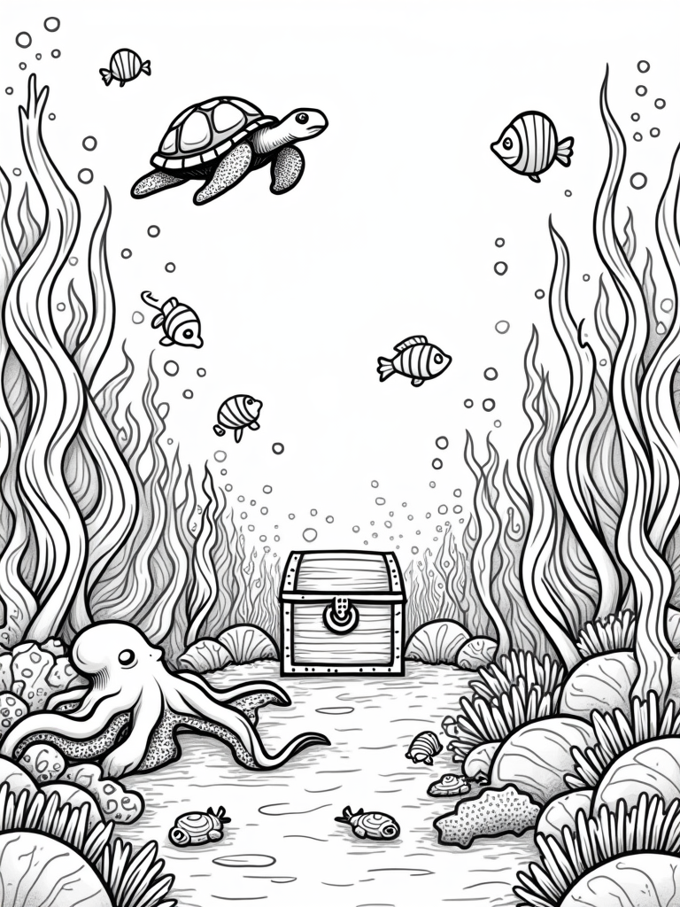 In the background, a sunken treasure chest peeks out from the sandy seafloor, surrounded by playful shrimp and tiny crabs. It's a lively scene that brings the ocean's wonders to life. Kids can let their imaginations run wild as they fill this underwater world with their favorite colors!