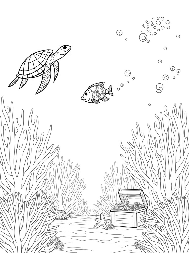 Underwater Garden with Coral, Fish, and a Sea Turtle Coloring Page