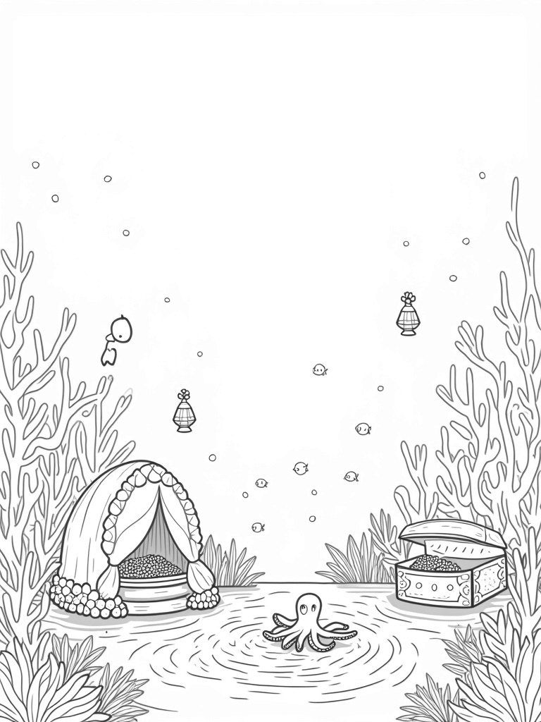 In this underwater garden, colorful coral formations create a vibrant playground for sea creatures. You’ll find charming fish-shaped lanterns floating gently, lighting up the scene. A giant seashell makes a cozy nook, perfect for any curious little critter looking for a place to relax. And don't miss the playful octopus, who’s wrapped its tentacles around a sunken treasure chest bursting with sparkling gems!